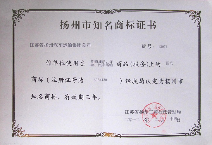 近日,集團(tuán)公司注冊的證號為6384430的“揚(yáng)汽”商標(biāo)(貨物遞送、導(dǎo)游、汽車運(yùn)輸)被揚(yáng)州市工商行政管理局認(rèn)定為“揚(yáng)州市知名商標(biāo)”。
