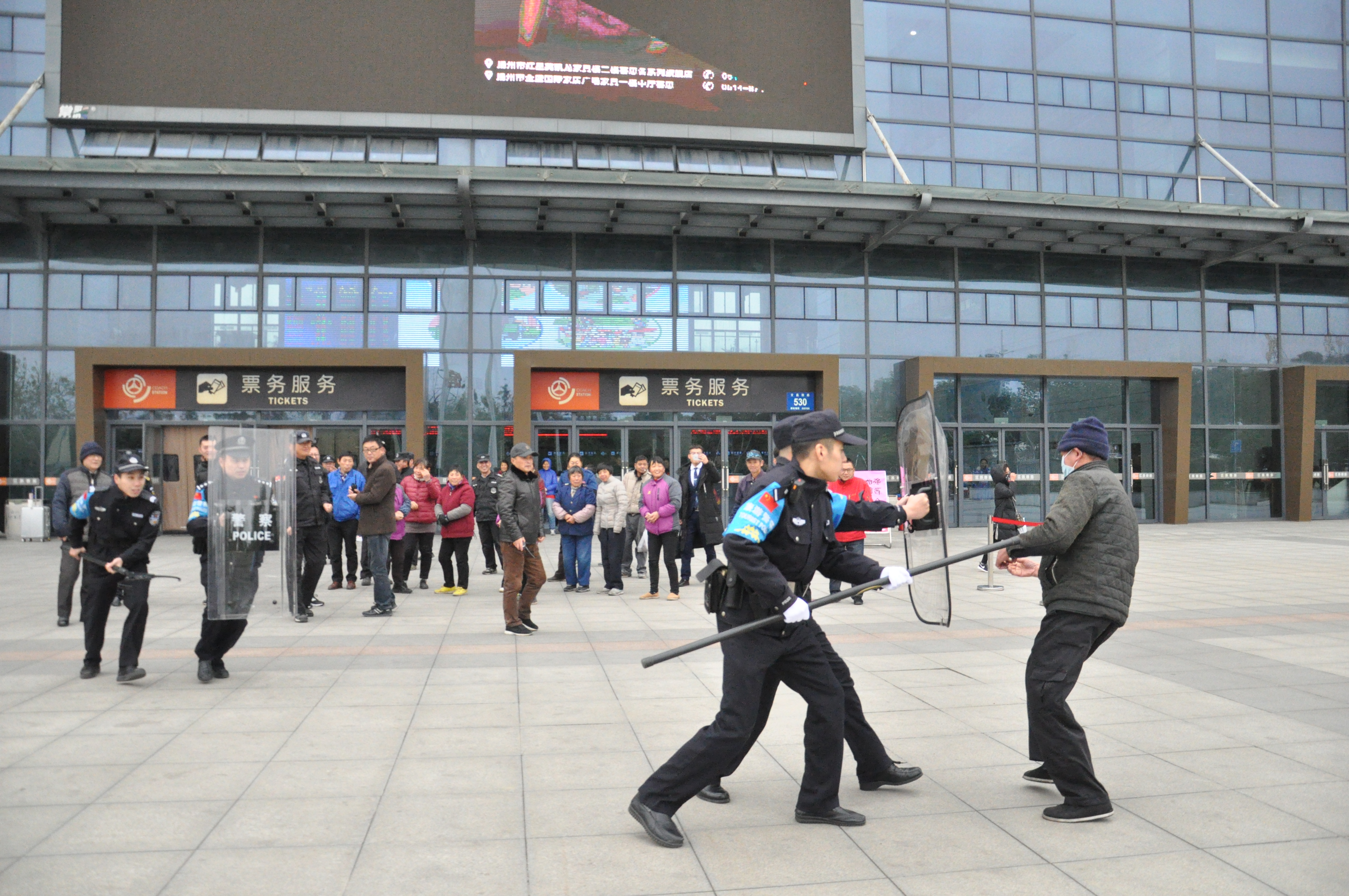 為有效防范公共場所可能發(fā)生的暴力恐怖事件,加強車站工作人員安全防范意識,提高對突發(fā)事件的應急處置能力,12月7日下午,揚州站聯合揚州市公安局公交治安分局汽車總站派出所,在站前廣場開展年度反恐防暴演練。