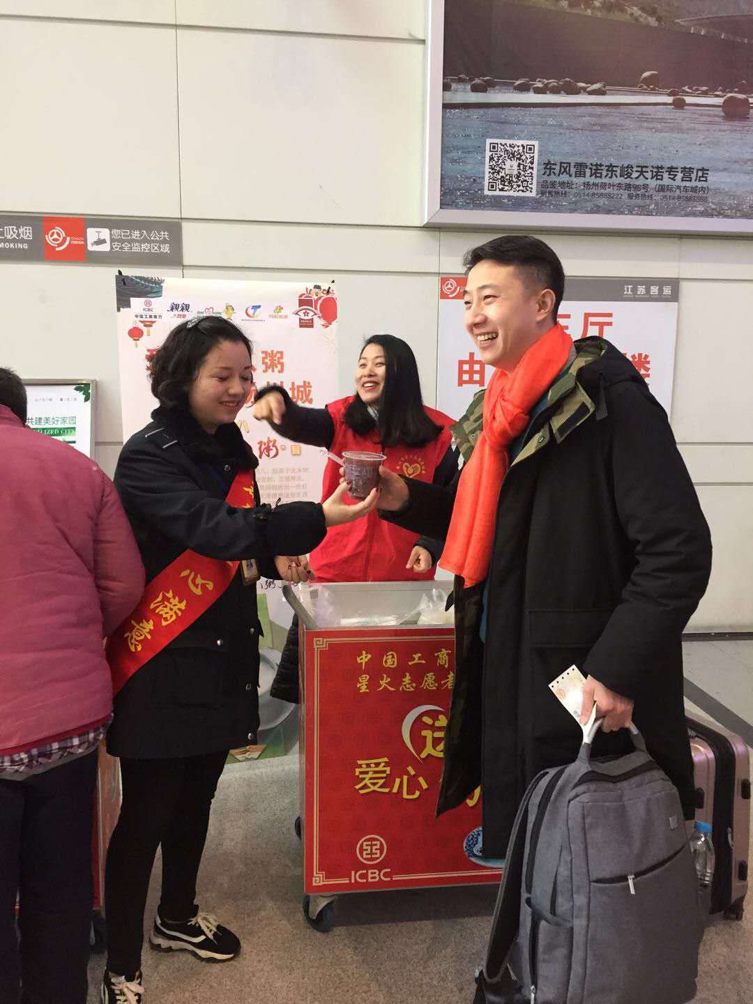 短短的一個半小時,送出了近三百份臘八粥和雪白的饅頭。把幸福喝進肚里,把快樂放在心上。山東臨沂的王師傅喝著臘八粥動情地說道:“沒想到回家的路上能在揚州汽車站感受到節(jié)日的快樂,揚州人真的善良”。
