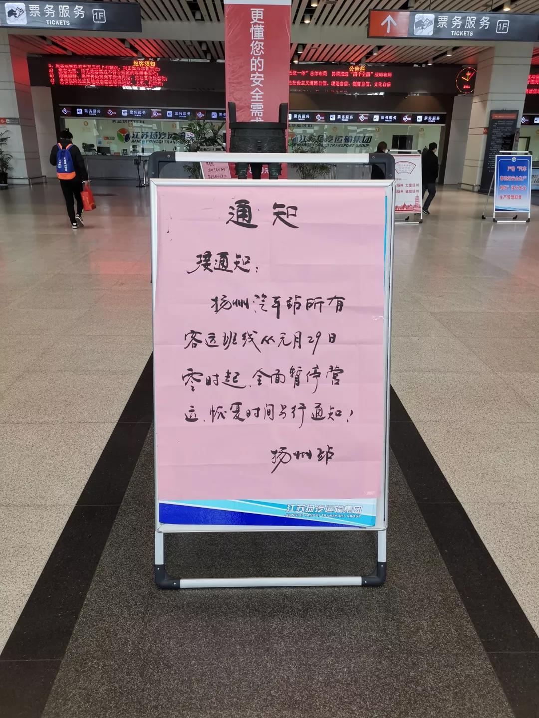 為進(jìn)一步配合我市做好新型冠狀病毒感染的肺炎疫情防控工作,遏制疫情通過交通渠道擴(kuò)散傳播,揚(yáng)汽集團(tuán)根據(jù)揚(yáng)州疫情防控工作需要,決定從2020年1月29日0時(shí)起,暫停揚(yáng)州汽車站、揚(yáng)州汽車東站及江都汽車客運(yùn)站的運(yùn)營,停發(fā)所有客車班線,暫停所有包車客運(yùn)業(yè)務(wù)。
