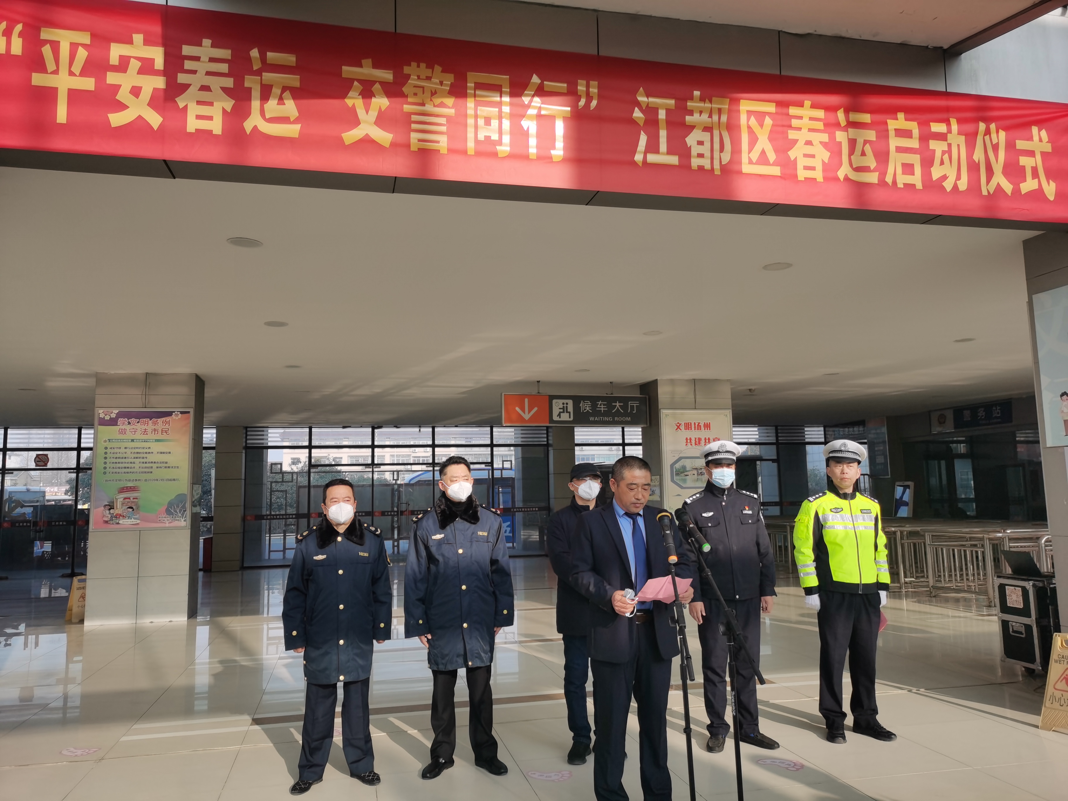 1月7日,2023年“平安春運 交警同行”啟動儀式在江都汽車客運站售票大廳內(nèi)舉行。江都區(qū)公安局副局長、交警大隊大隊長宦新宇,江都區(qū)交警大隊車管所所長滕斌,揚汽集團相關負責人參加活動。