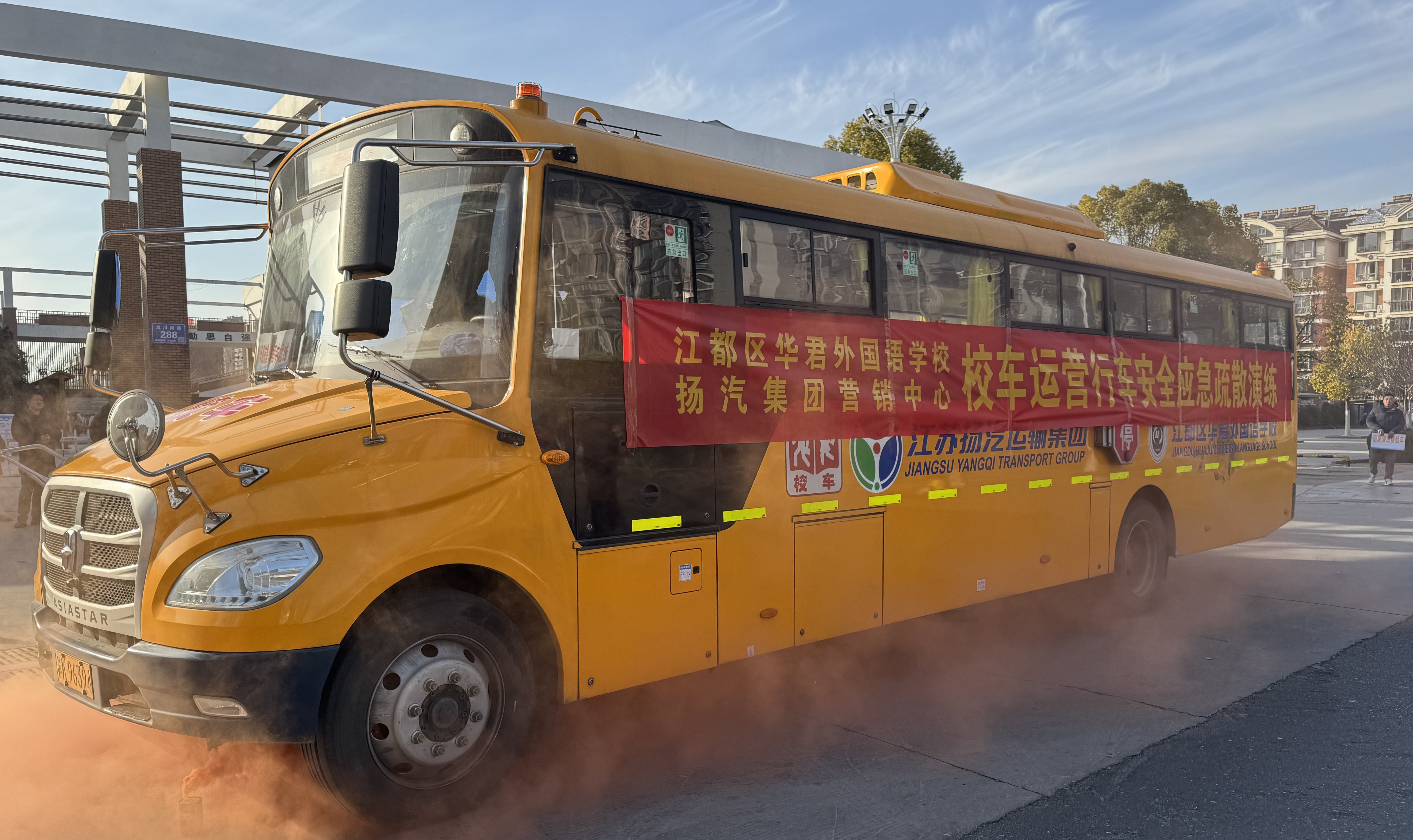 為進(jìn)一步加強(qiáng)校車安全管理,提高師生在校車行駛中的安全應(yīng)急疏散能力,近日,揚(yáng)汽集團(tuán)與江都區(qū)華君外國(guó)語(yǔ)學(xué)校聯(lián)合開展了校車運(yùn)營(yíng)行車安全應(yīng)急疏散演練。揚(yáng)汽集團(tuán)副總經(jīng)理劉旭亮,江都區(qū)華君外國(guó)語(yǔ)學(xué)校副校長(zhǎng)張?zhí)毂,各單位的安全管理人員及師生共40余人參加本次活動(dòng)。