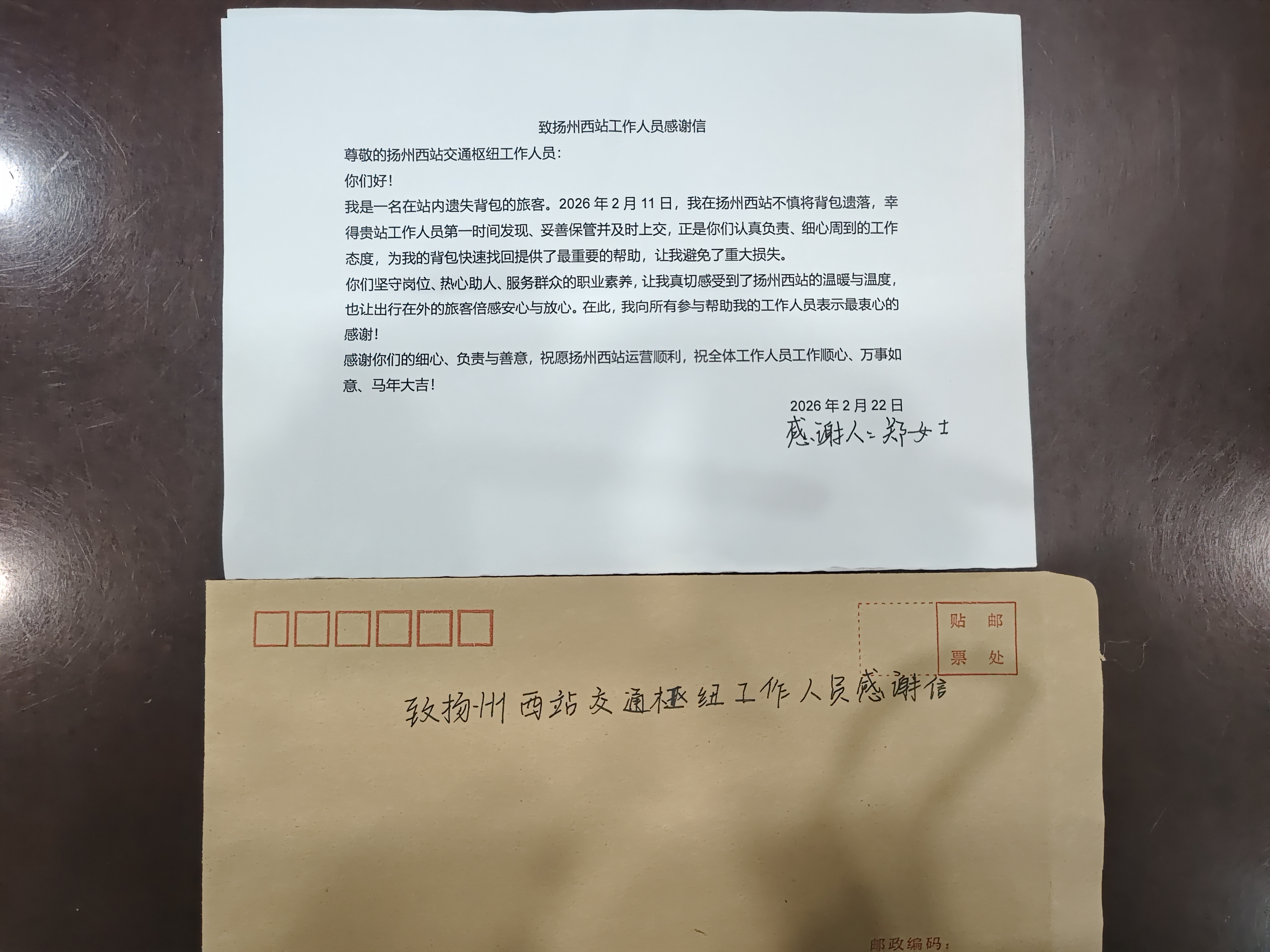 而這份“遲來”的感謝信,正是失主對揚州站工作人員認真負責態(tài)度的由衷肯定。信中寫道:“從發(fā)現失物到妥善保管、再到主動對接,每一個環(huán)節(jié)都體現出你們嚴謹細致、熱心助人的職業(yè)素養(yǎng)。正是因為有你們這樣堅守崗位、默默付出的工作人員,才讓揚州這座‘好地方’更溫暖、更安心。”